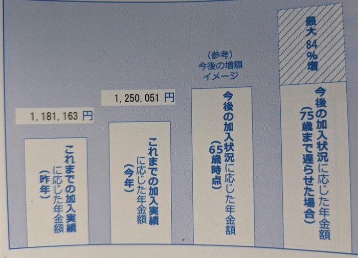 Combined with nenkin, I guess I might receive around 4m yen from my government pensions in retirement, which would likely be enough to live on. My wife will also receive nenkin, probably around a million yen a year.